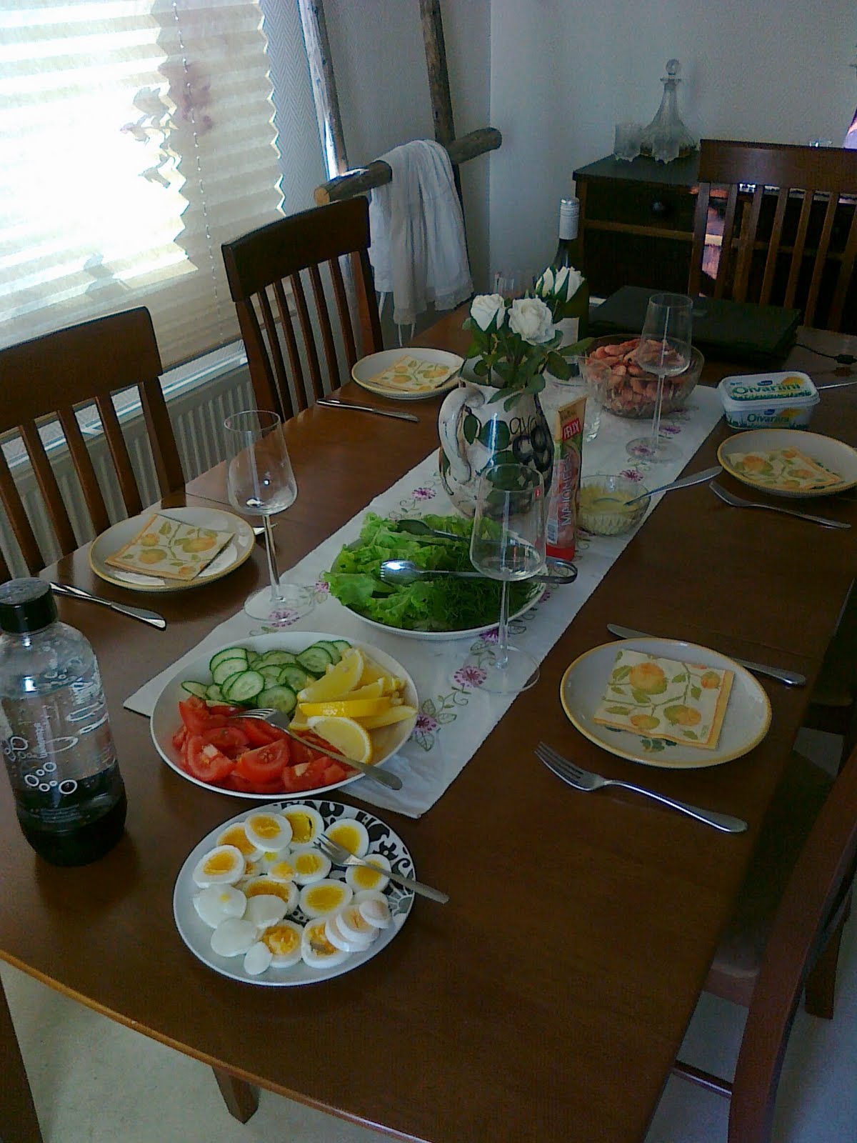 Efter maten stressade vi iväg i bastun, bastade och simmade på rekordtid, fixade oss, packade ihop och begav oss mot festligheterna på norrsidan. Ett nästan färdigt dukat kräftkalas väntade oss. Alla var fina och på gott humör, några hade drabbats av den stora höstförkylningen medan andra (de yngsta) ivrigt väntade på att klockan skulle slå 18.00 (smällare ni vet...). Vi satte oss till bords och åt allt från björnkött till scampi till grillad tonfisk till pastasallad till svamppaj... det fanns som ingen hejd på läckerheterna, en del mer välsmakande än de andra. Vi hade i alla fall hemskt trevligt tillsammans. Lagom till frågesporten utökades festen med två personer. Men, ju fler vi blir desto roligare är det, är en princip som vi gillar på Högören.